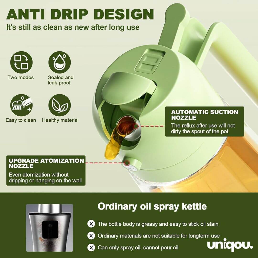 Anti-Drip Spout: No more messy hands or oil trails on your counter.